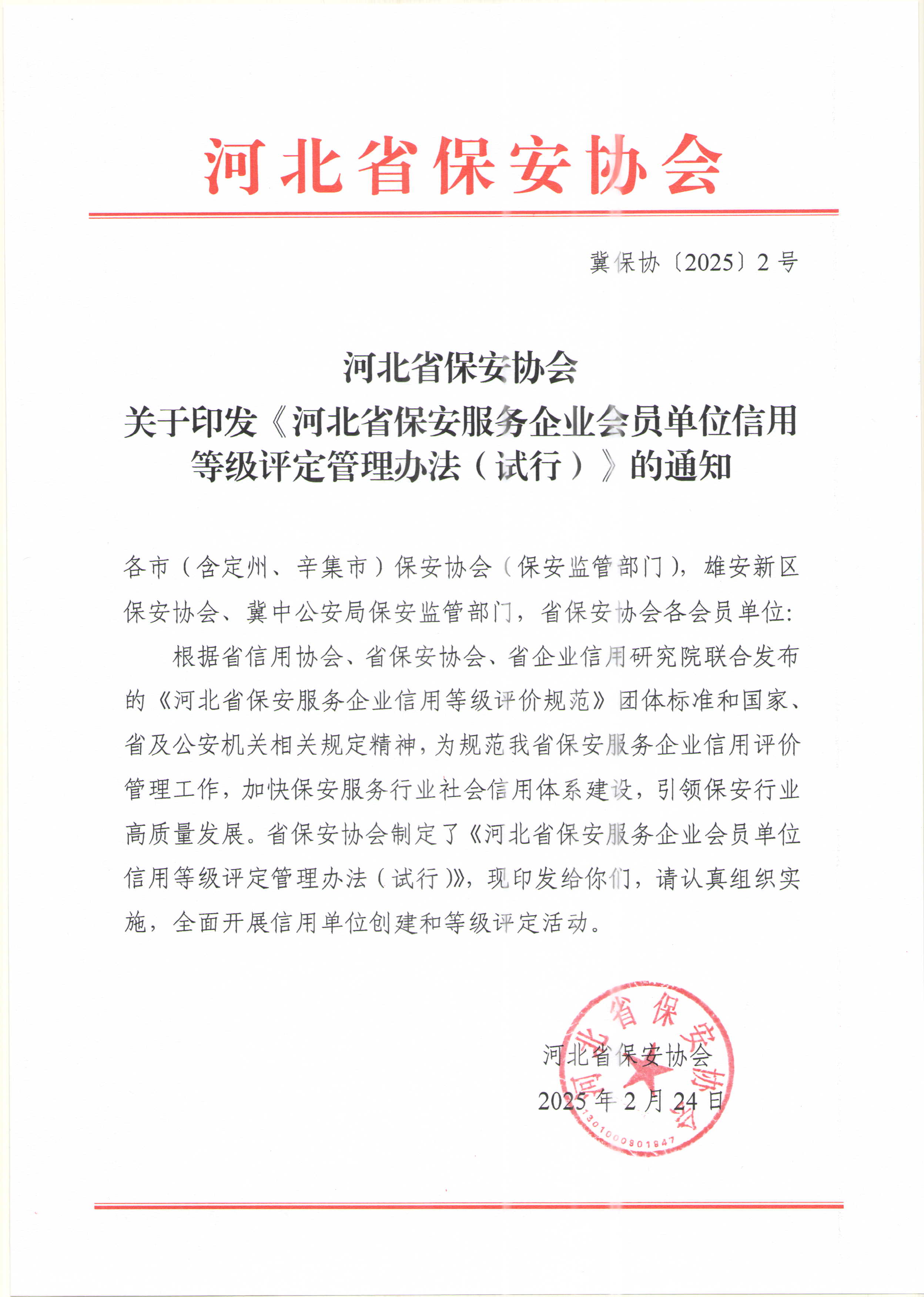 关于印发《河北省保安服务企业会员单位信用等级评定管理办法(试行)》的通知