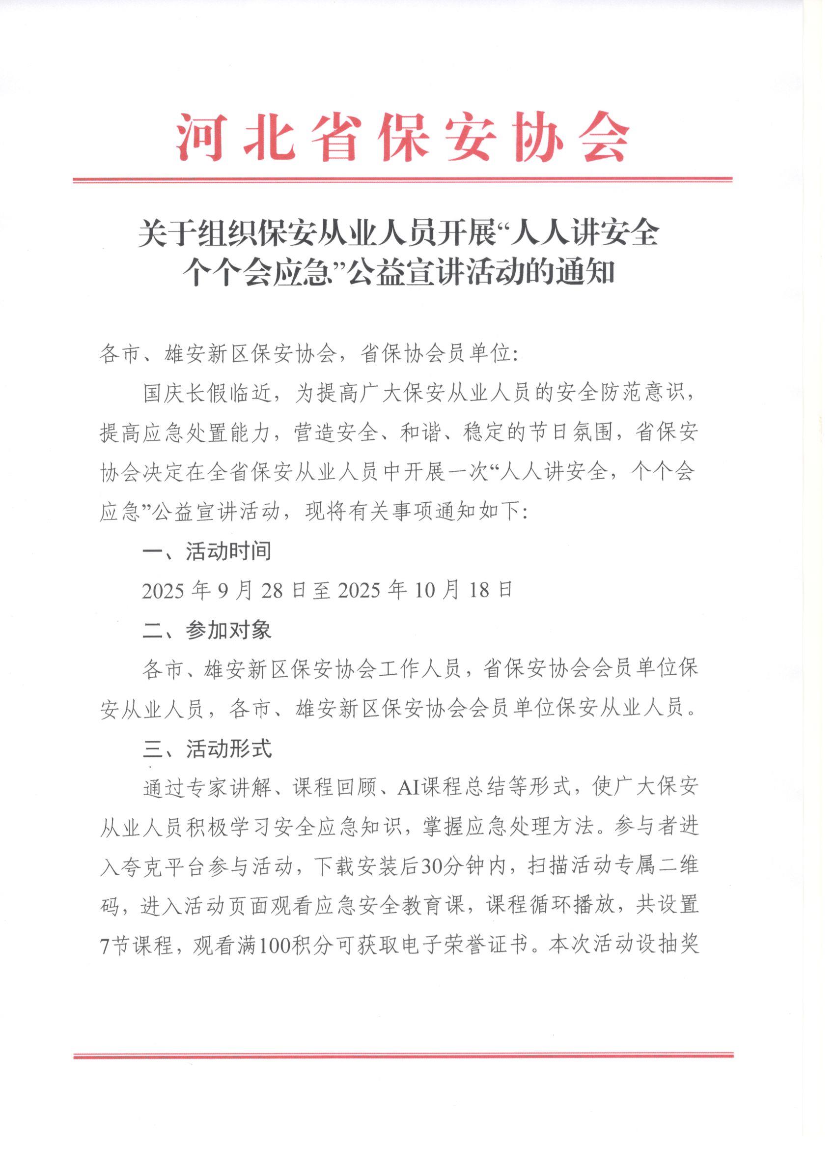 关于组织保安从业人员开展“人人讲安全个个会应急”公益宣讲活动的通知