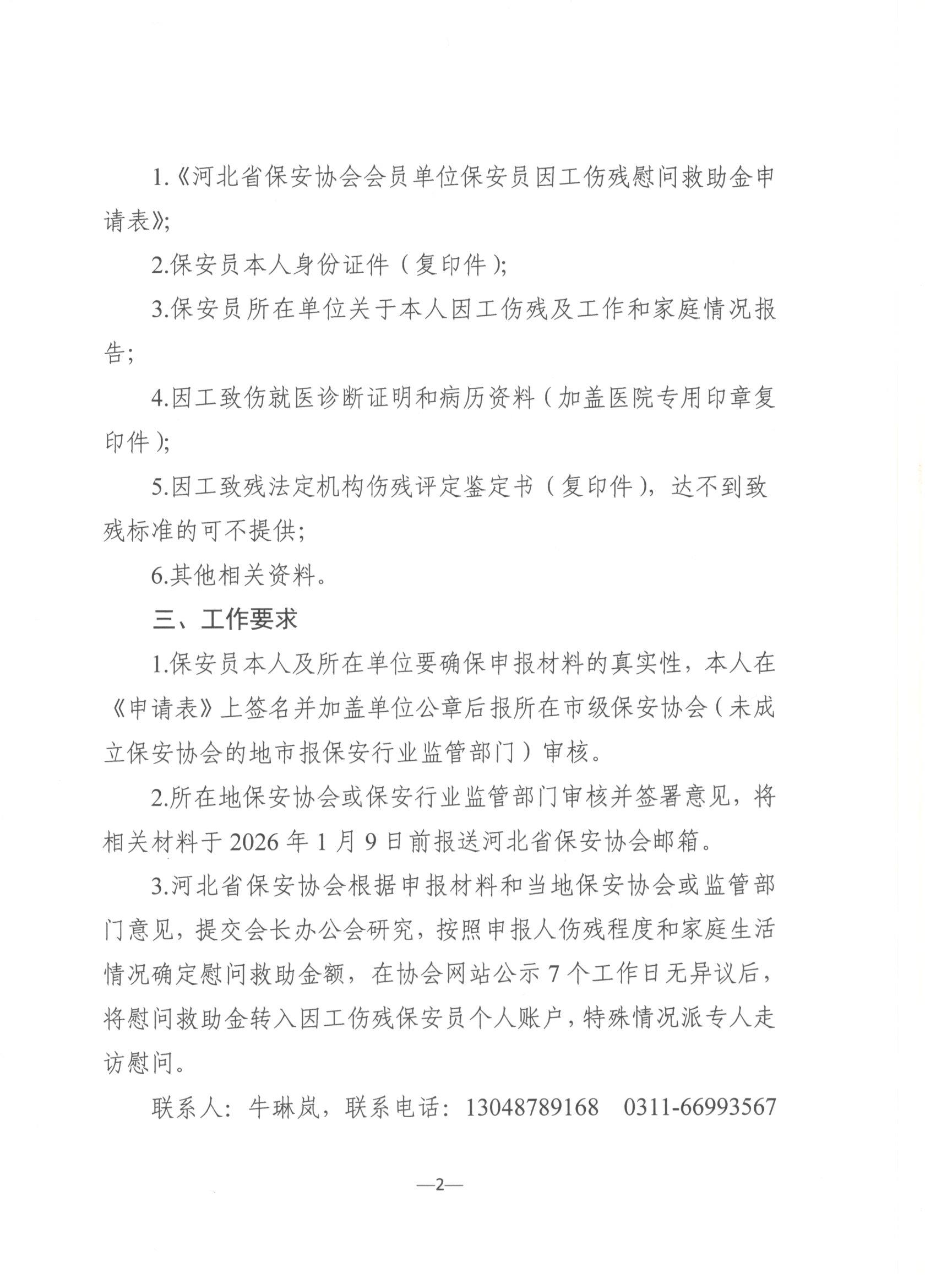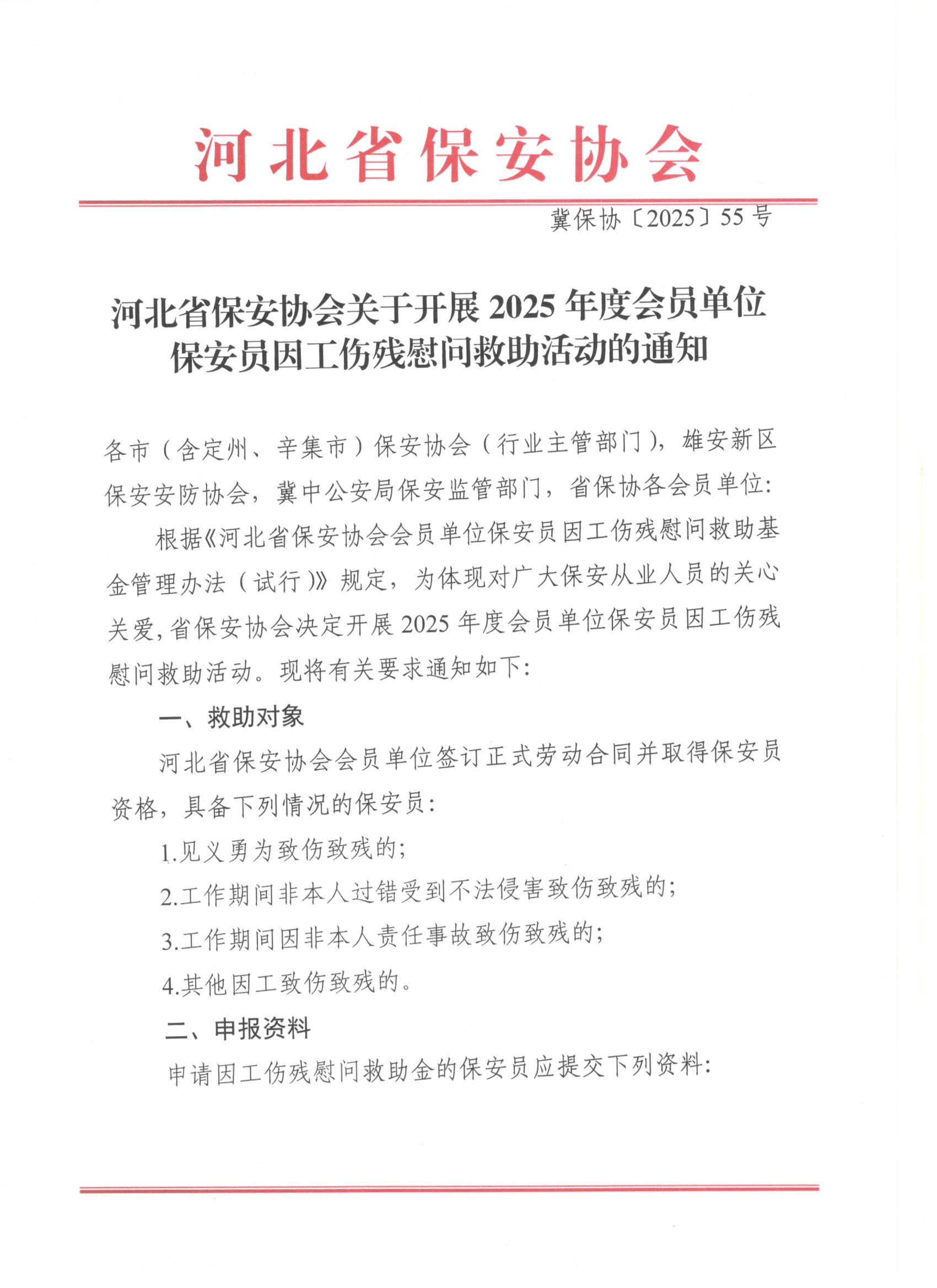 河北省保安协会关于开展2025年度会员单位保安员因工伤残慰问救助活动的通知