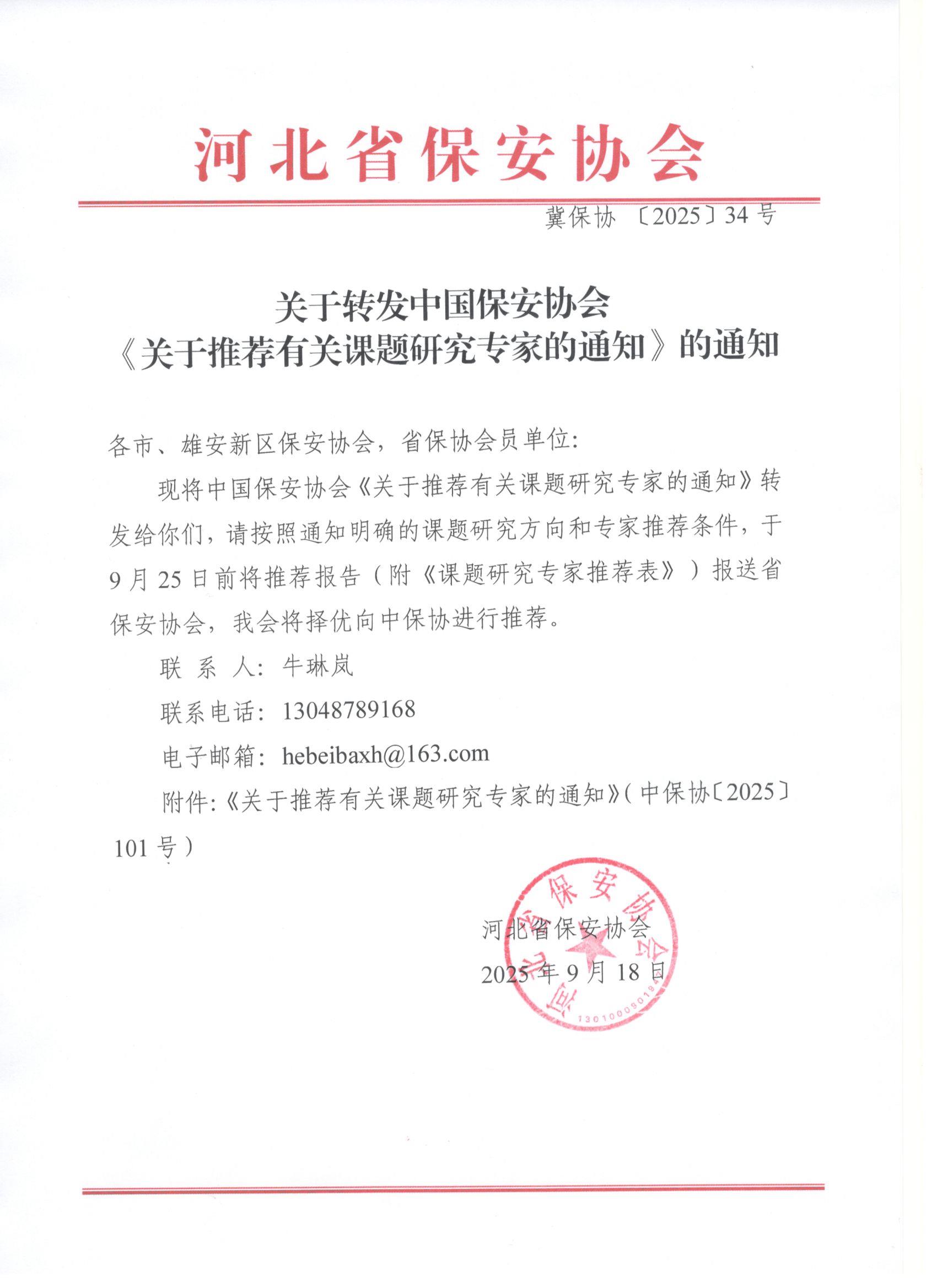 关于转发中国保安协会《关于推荐有关课题研究专家的通知》的通知