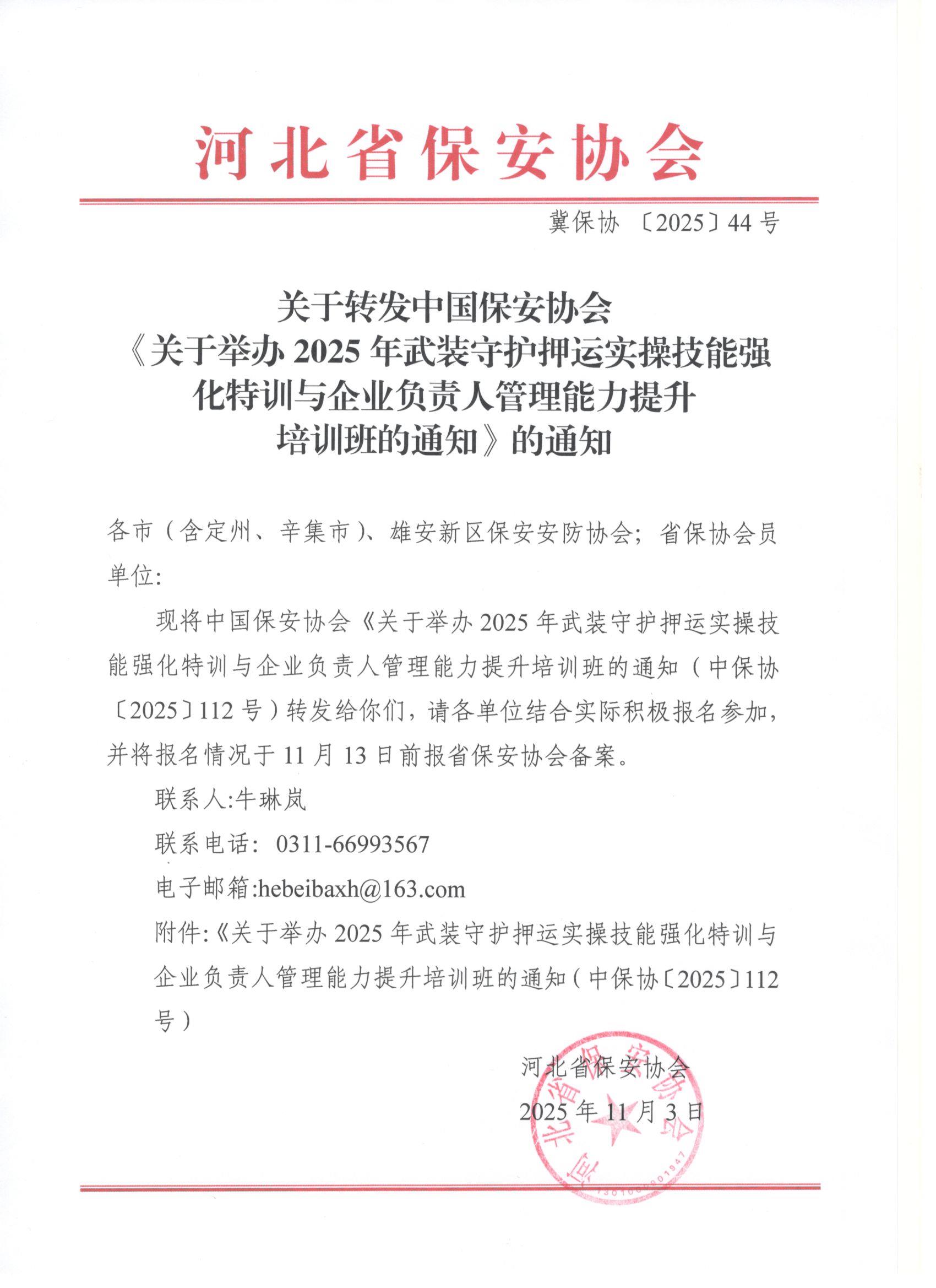 关于转发中国保安协会《关于举办2025年武装守护押运实操技能强化特训与企业负责人管理能力提升培训班的通知》的通知